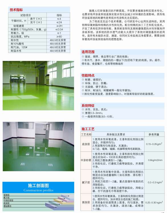 地坪特性:水性环保型、能在潮湿的环境施工、光泽柔和、质感佳,具有优异防腐、耐碱、耐油性能及良好透气性。